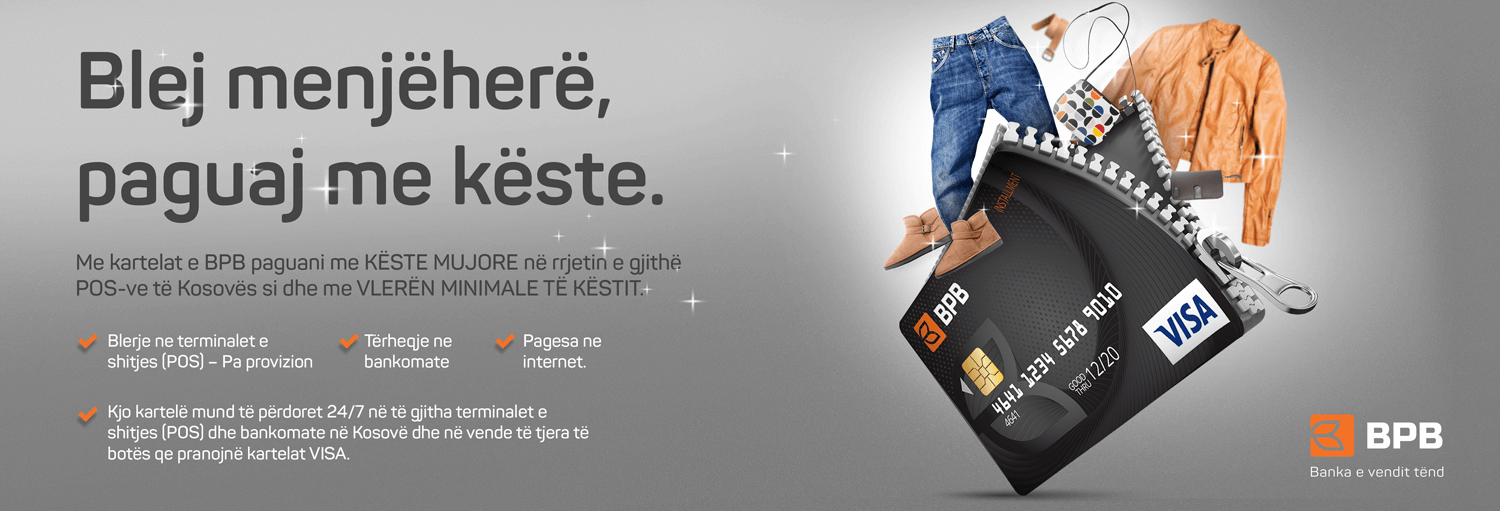 BPB ju ofron kartelat VISA* të pranuara ndërkombëtarisht. Përmes këtyre kartelave ju mund të bëni tërheqje në çdo bankomat dhe të kryeni pagesa në POS, 24/7 brenda dhe jashtë vendit.